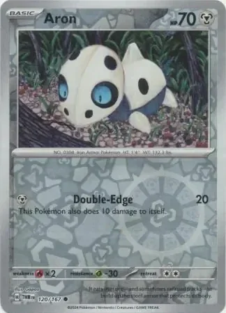 Unleash your inner trainer with the Twilight Masquerade Aron card! This Pokemon card adds a touch of mystery and excitement to your collection. Catch 'em all and join in on the fun with this playful and quirky addition.