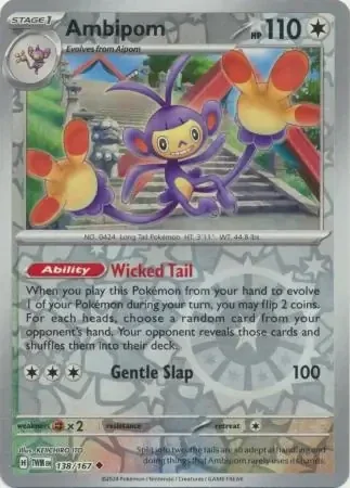 Unleash the playful power of Twilight Masquerade with this Ambipom pokemon card. Join the ultimate masquerade battle and experience the thrill of collecting and trading in a whole new way. Don't miss out on the fun, add this 138/167 card to your collection now!