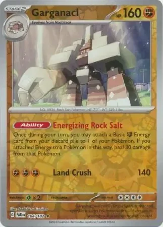 Unleash the power of your deck with Paradox Rift 104/182 Garganacl! This Pokemon card offers a unique and strategic advantage for trainers looking to strengthen their collection. With its eye-catching design and powerful abilities, this card is a must-have for any serious trainer. Catch 'em all today!