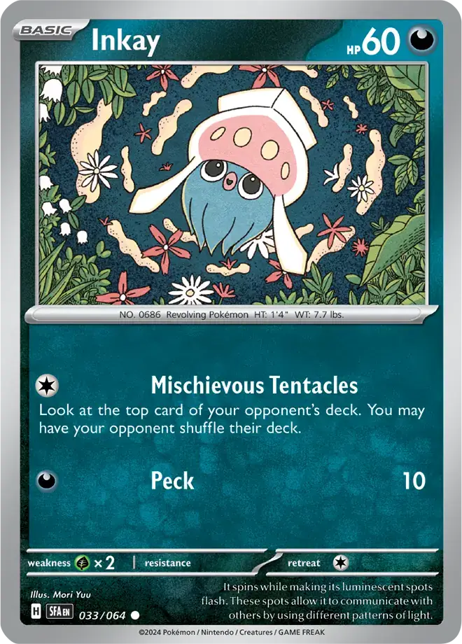 Get ready to add some charm to your collection with the shrouded Fable 033/064 Inkay Pokemon card! This quirky card features unique abilities and a playful design that's sure to stand out. Catch yours today!