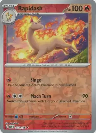 Take your Pokemon card collection to the next level with 151 078/165 Rapidash Rev Holo! This powerful card features stunning artwork and is a must-have for any Pokemon trainer. Enhance your game and impress your opponents with this rare find. Add it to your deck today!