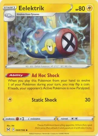 Unleash electric shocks with the Lost Origin 060/196 Eelektrik Pokemon card. Add some power to your collection with this electrifying addition. Catch 'em all with a jolt of excitement!
