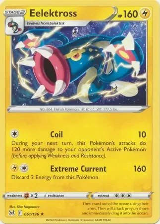 This electric pokemon card boasts a Lost Origin design, making it a rare collector's item. With powerful attacks and a unique backstory, this Eelektross card is the perfect addition to any pokemon deck. Gotta catch 'em all!