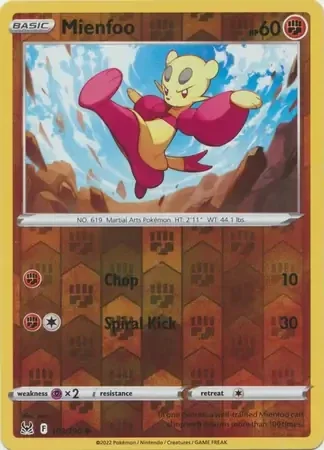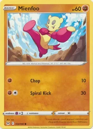 Unleash the power of Lost Origin 103/196 Mienfoo in your next Pokémon battle with this rare and sought-after card. With its sleek design and impressive abilities, this card is sure to be a game changer. Catch it while you can and add it to your collection (and your victory streak)!