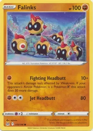 Unleash the fierce battle skills of Lost Origin 110/196 Falinks with this Pokemon card. Take your deck to the next level with this powerful addition and dominate your opponents in epic duels. Get ready to catch em' all! (Gotta catch em' all, Pokemon!)