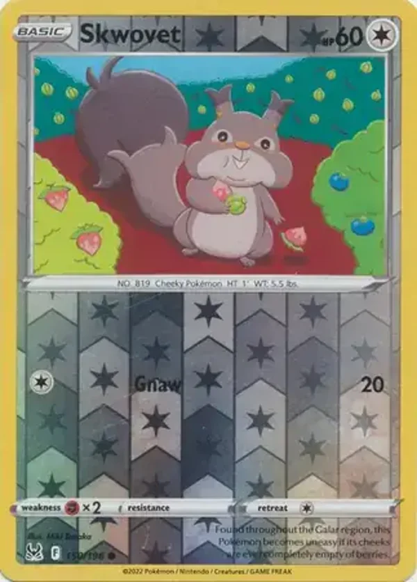 Catch the cutest addition to your Pokemon collection with the Lost Origin 150/196 Skwovet trading card. This playful Pokemon card will add some flavor to your deck and bring some quirky fun to your battles. Don't miss out on this unique and charming card. Get it now!