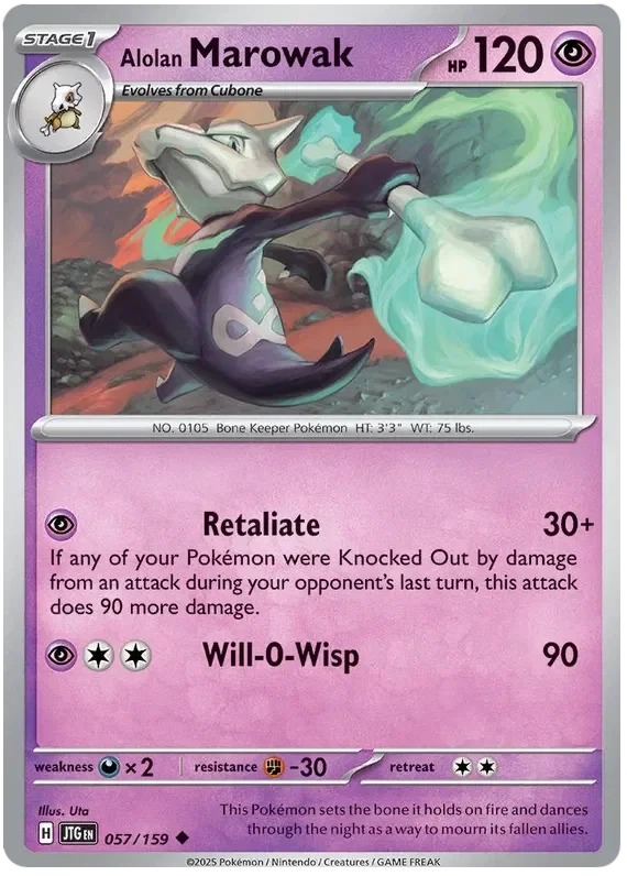 Journey Together 057/159 Alolan Marowak Pokémon card from the Journey Together series. Renowned for its versatile support moves and disruptive capabilities, this card provides strategic control and protection in battle.
