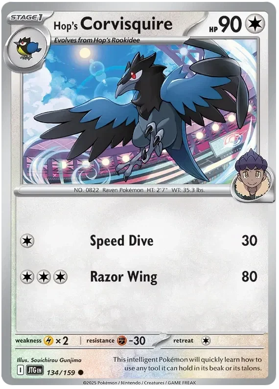Journey Together 134/159 Hop's Corvisquire is a strategic card from the Journey Together set, featuring Hop's Corvisquire with enhanced speed and tactical versatility. Valued by competitive players for its ability to support aggressive strategies and by collectors for its detailed artwork and rarity, this card strengthens both gameplay and collection. Adding Hop's Corvisquire to your deck provides dynamic options and a key evolution stage in your Pokémon lineup.