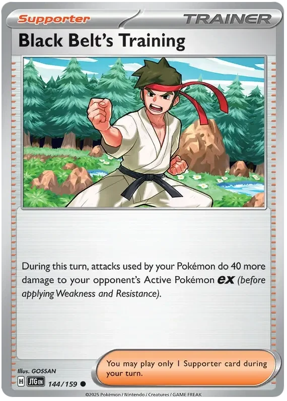 Journey Together 144/159 Black Belt's Training is a strategic Trainer card from the Journey Together set, tailored to support Fighting-type Pokémon. This card offers competitive players enhanced offensive capabilities and tactical flexibility, making it a valuable asset in battle. Collectors also value its detailed artwork and rarity, adding both gameplay strength and collectible appeal to your deck.