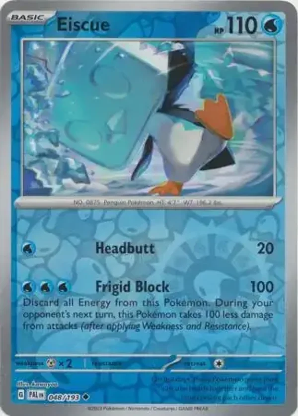 The Paldea Evolved Eiscue is a must-have for any avid Pokemon collector. Its striking 048/193 design will surely complete your collection. Don't miss out on this valuable addition with its potential for future rarity and trade value.