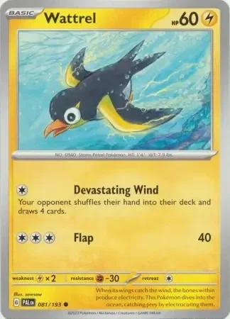 Introducing the Paldea Evolved 081/193 Wattrel, the must-have Pokemon card for any collector or trainer! With its stunning design and powerful abilities, this card will take your Pokemon game to the next level. Perfect for battling or displaying, don't miss out on adding this rare card to your collection.