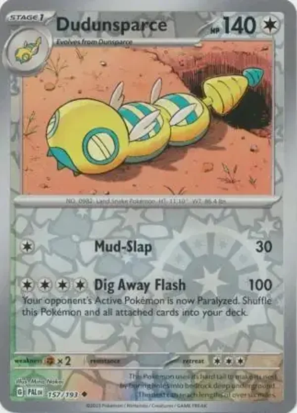 Upgrade your collection with the powerful Paldea Evolved Dudunsparce Pokemon card. Unleash its potential in battles and become a true Pokemon master. Don't miss out on this opportunity to level up your game. Catch it now!
