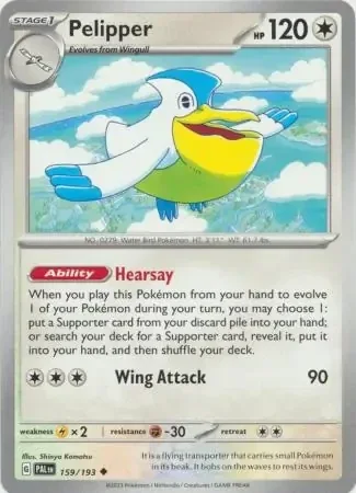 Catch them all with the Paldea Evolved 159/193 Pelipper Pokemon card. Evolve your collection with this rare find and become the ultimate trainer. The perfect addition to any Pokemon fan's collection. Train, battle, and win with confidence.