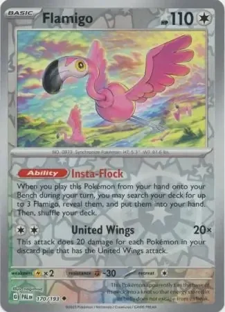 Introducing the Paldea Evolved 170/193 Flamigo! This impressive Pokemon card boasts powerful abilities and a stunning design. Enhance your collection and dominate your battles with this must-have addition. Catch 'em all with Paldea Evolved!