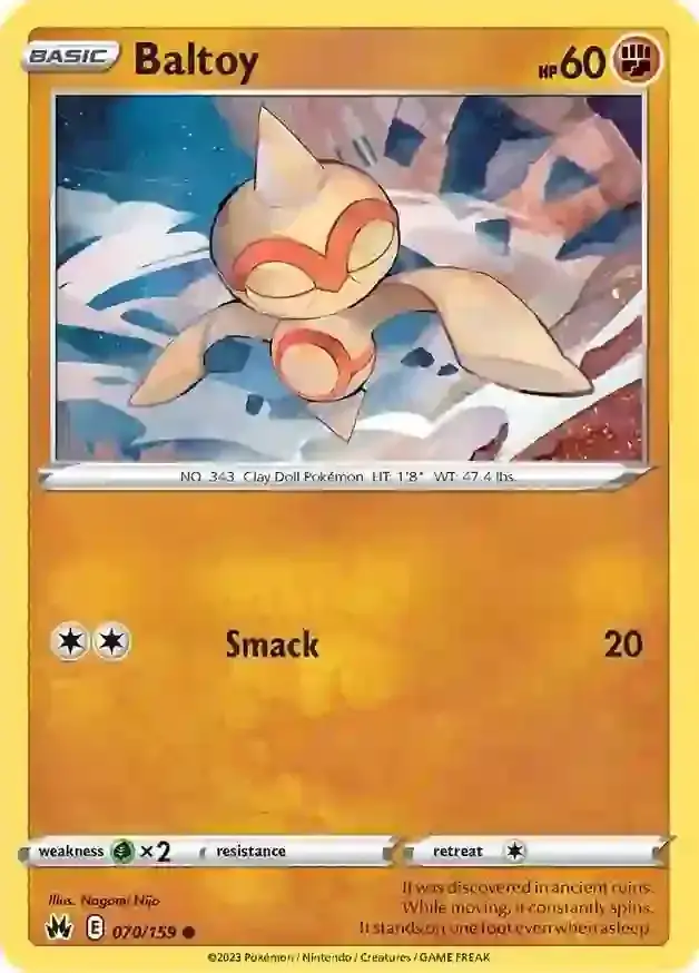 Unleash your inner collector with the Crown Zenith 070/159 Baltoy Pokemon card. With its unique design and rarity, this card is a must-have for any Pokemon fan. Add it to your collection and show off your love for these adorable creatures.