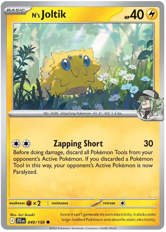 Journey Together 049/159 N's Joltik is a Pokémon card from the Journey Together series, featuring a special variant linked to the character N. This card offers strategic value through its quick attacks and evolution potential, providing tactical flexibility in battle. With detailed artwork and accurate game statistics, N's Joltik is a prized addition for collectors and competitive players aiming to strengthen their decks with a unique and agile Pokémon.