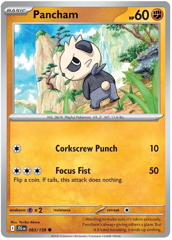 Journey Together 083/159 Pancham is a legendary Pokémon card from the Journey Together series. Known for its exceptional defensive strength and powerful attacks, this card offers strategic resilience and battlefield control. Featuring detailed artwork and precise game statistics, Pancham is an essential addition for collectors and competitive players seeking to build durable and impactful decks.
