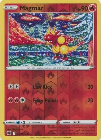 Improve your Pokemon card collection with the Brilliant Stars 019/172 Magmar. This professionally designed card features a Magmar character with unique abilities to enhance your gameplay. Add this valuable card to your collection now and increase your chances of winning battles.