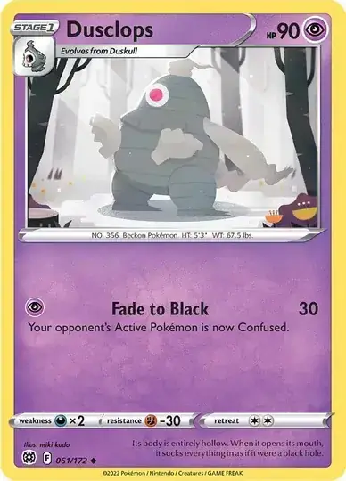 This Pokemon card, Brilliant Stars 061/172 Dusclops character. A must-have for any collector or avid fan, this card showcases stunning artwork and adds value to your collection. Don't miss your chance to own this rare and highly sought-after piece of the Pokemon universe.