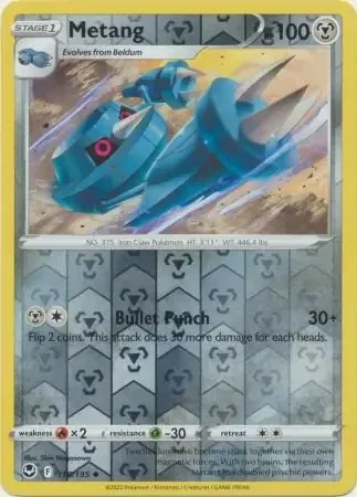 Introducing Silver Tempest 118/195 Metang pokemon card, the perfect addition to any collector's set. With stunning visuals and vibrant colors, this card is sure to impress. Its rarity and value make it a must-have for any true Pokemon fan. Don't miss out on the chance to catch this coveted card.