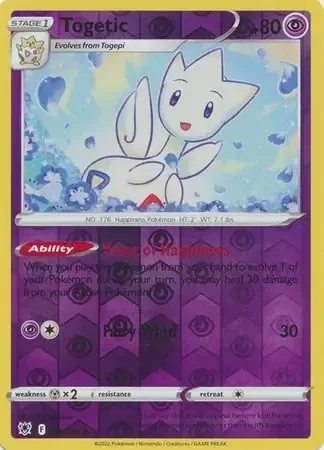 Unleash the power of the Astral Radiance 056/189 Togetic Rev Holo Pokemon card. This rare card boasts impressive features, perfect for any trainer's collection. Strike your opponents with lightning-fast attacks and dominate the battle. Upgrade your deck and outsmart your opponents with this unique card.
