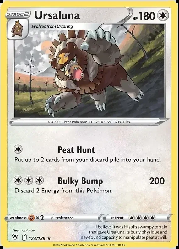 Enhance your collection with the Astral Radiance 124/189 Ursaluna Pokemon card. Don't miss out on this must-have card featuring stunning artwork and powerful abilities. Add it to your deck and increase your chances of victory in battles. Gotta catch 'em all!