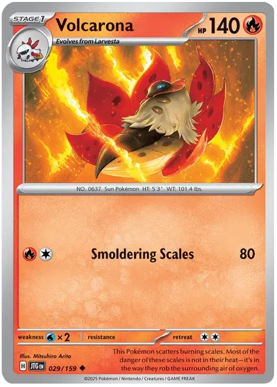 Journey Together 029/159 Volcarona is a powerful Bug/Fire-type Pokémon card from the Journey Together set. As the evolved form of Larvesta, it boasts impressive offensive capabilities and versatile moves that can control the battlefield. With detailed artwork and precise game statistics, Volcarona is an essential card for collectors and competitive players seeking to enhance their decks with a dynamic and formidable Pokémon.