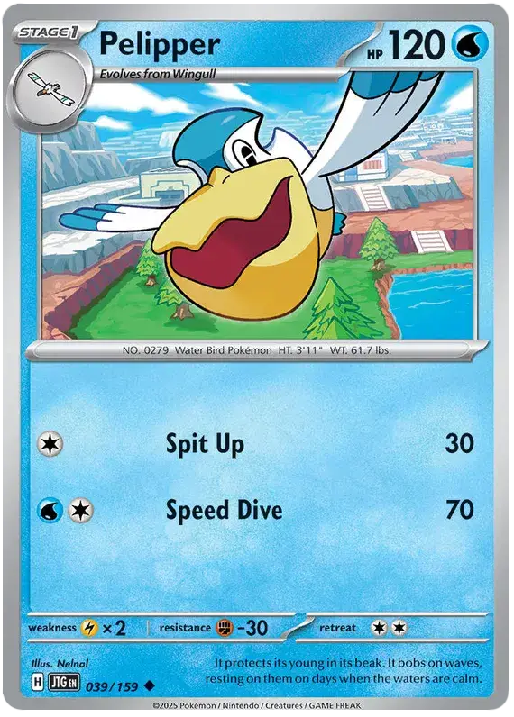 Journey Together 039/159 Pelipper is a Pokémon card from the Journey Together set. Known for its supportive abilities and tactical versatility, this card enhances deck strategy by facilitating energy management and battlefield control. Featuring detailed artwork and accurate game statistics, Pelipper is an essential addition for collectors and competitive players aiming to build balanced and effective decks.