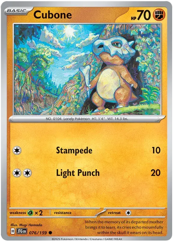 Journey Together 076/159 Cubone is a Pokémon card from the Journey Together series. Known for its resilience and tactical potential, this card offers strategic defensive options and evolution prospects. Featuring detailed artwork and accurate game statistics, Cubone is a valuable addition for collectors and competitive players seeking to build durable and effective decks.