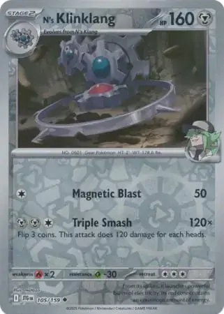 Journey Together 105/159 N's Klinklang Rev Holo is a key card in the Journey Together set, featuring N's Klinklang with powerful abilities that enhance strategic play. This card is highly regarded by collectors for its rarity and detailed artwork, making it a valuable addition to any collection. Incorporate N's Klinklang into your deck to maximize tactical options and elevate your competitive gameplay.