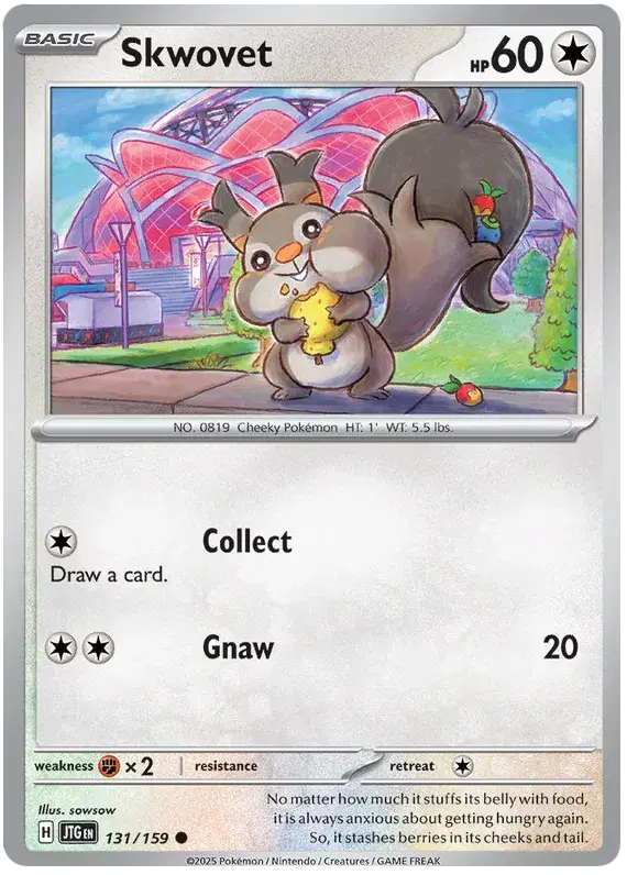 Journey Together 131/159 Skwovet is a valuable card from the Journey Together set, featuring Skwovet’s resourceful nature and tactical potential. Favored by competitive players for its ability to support energy management and by collectors for its detailed artwork and rarity, this card enhances both gameplay and collection. Adding Skwovet to your deck provides strategic depth and a versatile addition to your Pokémon lineup.
