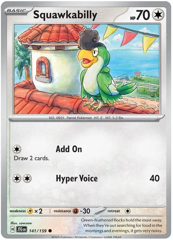 Journey Together 141/159 Squawkabilly is a dynamic card from the Journey Together set, featuring Squawkabilly’s agility and tactical versatility. Valued by competitive players for its speed and disruptive potential, this card also appeals to collectors due to its rarity and detailed artwork. Incorporate Squawkabilly into your deck to enhance your strategic options and strengthen your collection with a unique Pokémon.