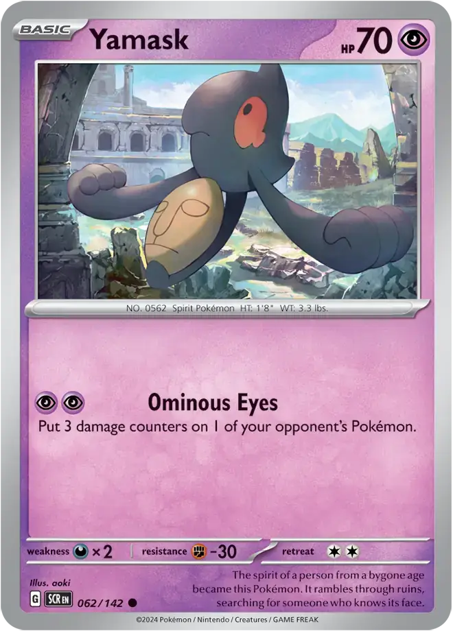 Catch 'em all with the Stellar Crown 062/142 Yamask Pokemon card! This unique card is a must-have for any Pokemon collector. (Gotta collect 'em all!) Show off your love for the game and add this rare card to your collection today.
