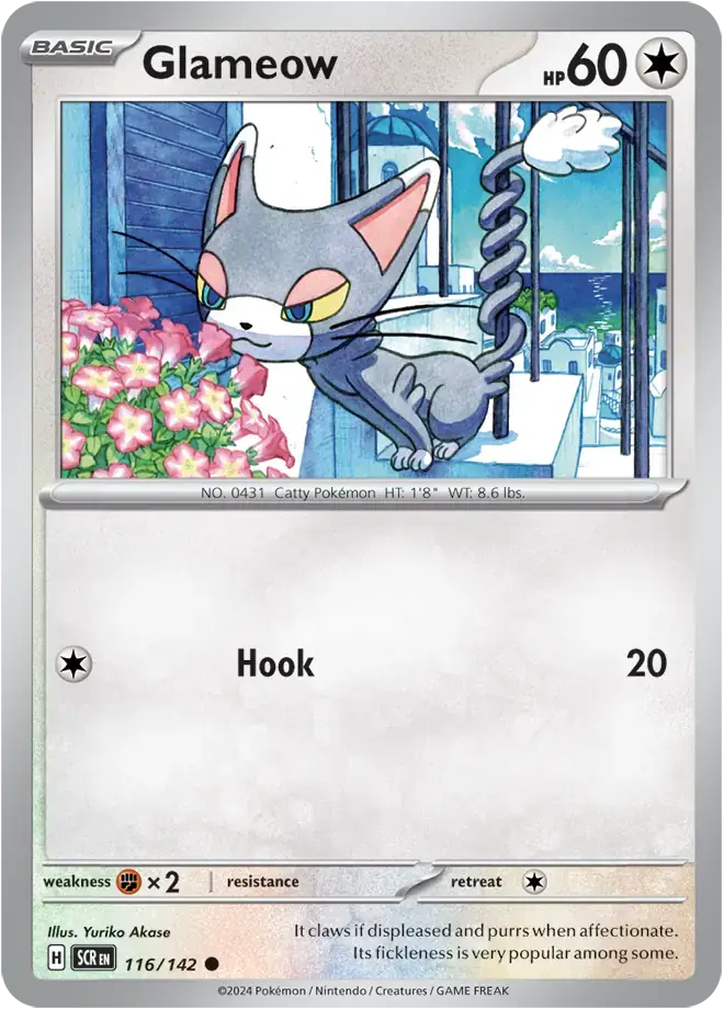Unleash the power of Glameow with the Stellar Crown 116/142 pokemon card. This card is a collector's dream with its striking design and rare abilities. Perfect for any pokemon fan, this card is sure to add some sparkle to your collection.