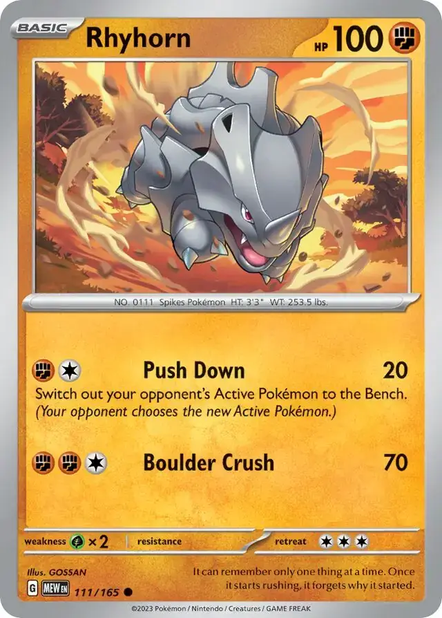 Catch them all with the 151 111/165 Rhyhorn Pokemon card. Perfect for fans and collectors alike, this card is a must-have addition to any deck. Get ready to battle with its powerful features, and show off your skills as a trainer. Start your journey with this must-have card today.