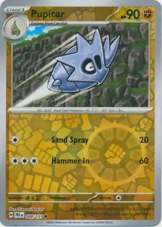 Introducing the Prismatic Evolutions 048/131 Pupitar - a powerful Pokemon card that will enhance any collection. With stunning prismatic design, this card is sure to catch the eye of any player or collector. Don't miss out on the chance to add this rare and valuable card to your inventory.