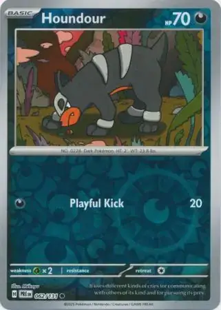 Gain an upper hand in Pokemon battles with the Prismatic Evolutions 062/131 Houndour card. This professionally crafted card features unique designs and advanced technology that will give you the edge over your opponents. Add this essential card to your collection today.