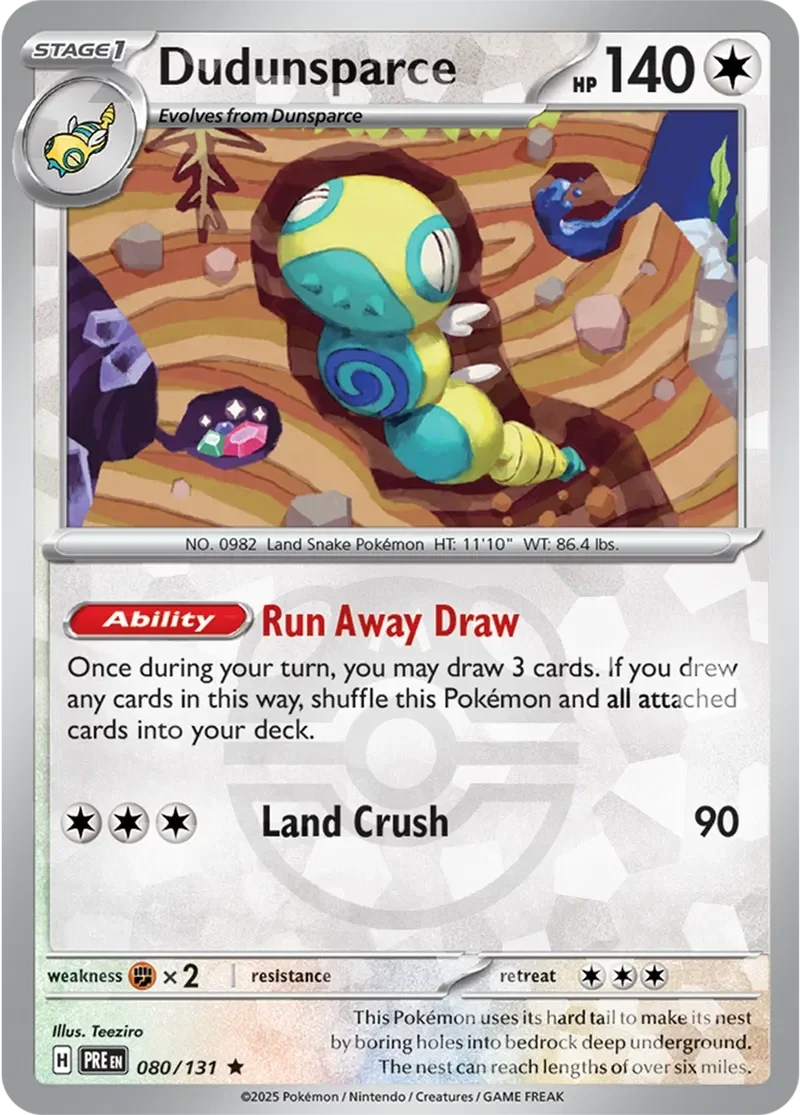 Discover the power of Prismatic Evolutions 080/131 Dudunsparce, a dynamic pokemon card that will elevate your game. With its unique design and abilities, this card is a must-have for any trainer. Enhance your strategy and impress your opponents with this versatile and coveted pokemon card.