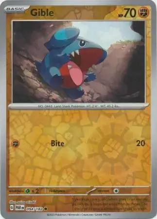 Upgrade your collection with Paradox Rift 094/182 Gible. This limited edition pokemon card is a must-have for any fan. Unleash the power of Gible and its unique abilities in your next battle. Don't miss out on this opportunity to take your game to the next level.