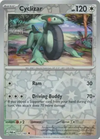 Catch them all with Paradox Rift 157/182 Cyclizar pokemon card. This rare and powerful card is a must-have for any pokemon trainer. Its unique abilities and impressive stats will give you the upper hand in any battle. Add it to your collection today and become the ultimate pokemon master!