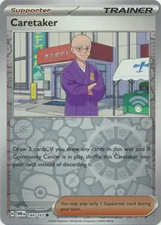 Catch 'em all at the Twilight Masquerade with this rare Catch 'em all at the Twilight Masquerade with this rare Caretaker Pokémon card! Playfully mask your opponents with this 144/167 card, perfect for any game or collector. Don't miss out on this quirky addition to your Pokémon collection!Pokémon card! Playfully mask your opponents with this 144/167 card, perfect for any game or collector. Don't miss out on this quirky addition to your Pokémon collection!