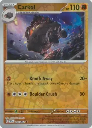 Experience the power of the Temporal Forces 094/162 Carkol Pokemon card. With its unique abilities, this card is a must-have for any collector or player. Dominate the game with its unmatched strength and strategy. Add it to your collection today and elevate your game to the next level.