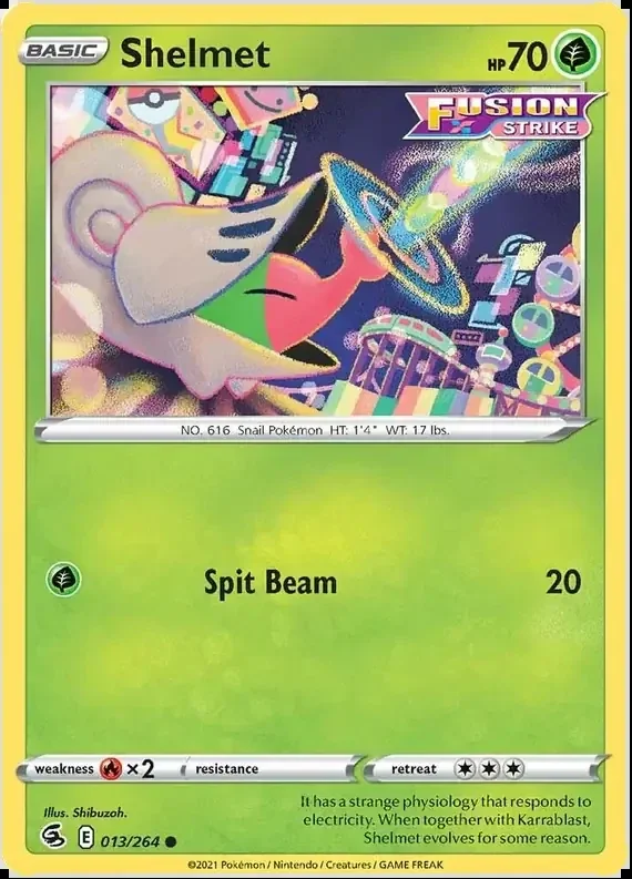 Expertly crafted, the Fusion Strike 013/264 Shelmet is a highly collectible Pokemon card. With its stunning design and rarity, it's sure to add value to any collection. Don't miss your chance to own this must-have card for any Pokemon enthusiast.