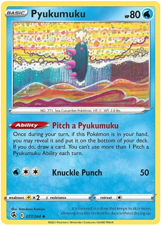 Fusion Strike 077/264 Pyukumuku is the ultimate collectible for any Pokemon fan. This powerful pokemon card will take your collection to the next level with its impressive stats and abilities. Don't miss out on the opportunity to own this rare and valuable addition to your collection.
