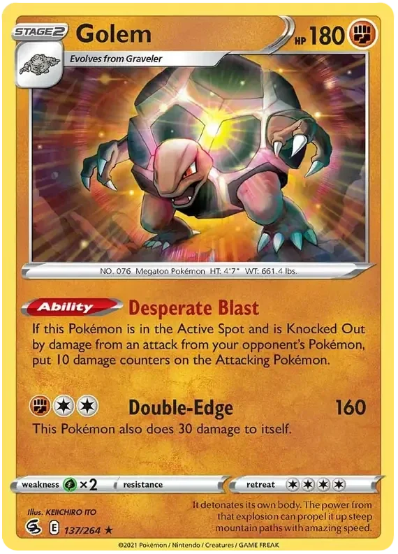 Increase your collection with the Fusion Strike 137/264 Golem Pokemon card. Own this rare card to add to your strategic playing. Take advantage of its unique abilities and showcase your expertise in battles.