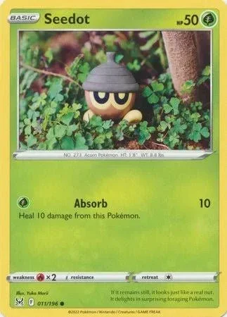 Add some fiery fun to your Pokemon collection with the Lost Origin 011/196 Seedot card! This quirky card will make your opponents sweat with its powerful abilities. Don't miss out on this must-have for any dedicated Pokemon trainer. Gotta catch 'em all!