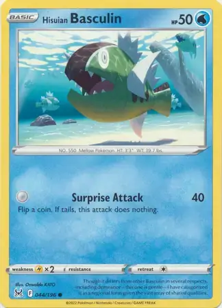 Catch the nostalgia with Lost Origin's Basculin! This Pokemon card, numbered 044 out of 196, is a must-have for any collector. Add some aquatic energy to your deck with this rare find. (Gotta catch 'em all, right?)