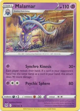 Unleash your inner trainer with the Lost Origin 078/196 Malamar! This quirky Pokémon card is perfect for any collector or player. With its design, you'll be sure to stand out in any battle. Catch 'em all and add this unique card to your collection today!