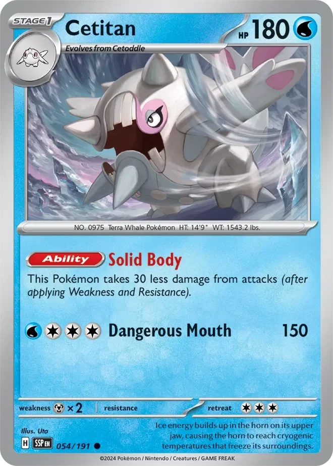 This Pokemon card from the Surging Sparks 054/191 Cetitan, is a valuable addition to any collection. With its unique design and rarity, it is a must-have for serious collectors and players. Expertly crafted and packaged in protective plastic, this card is sure to impress. Catch it now!