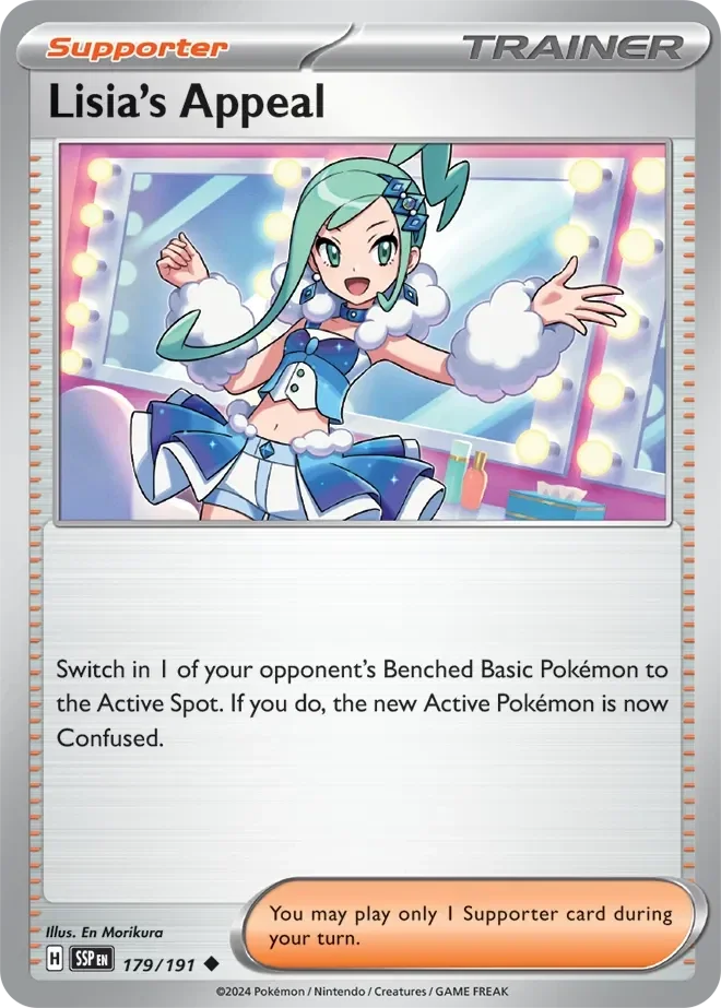 Meet the Surging Sparks 179/191 Lisia's Appeal, a standout piece for your Pokémon card collection. With its strong stats and unique abilities, this card is a game-changer for any dedicated player. Its clever design and strategic edge will give you the upper hand in every match.